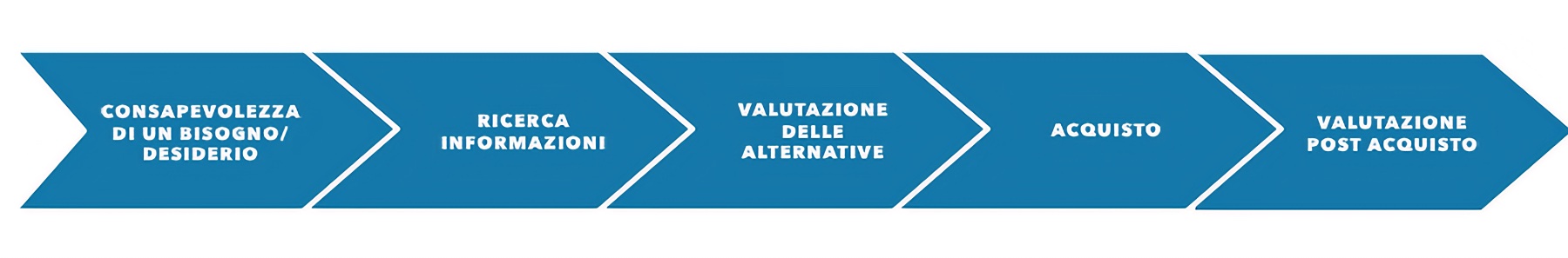 Il primo passo è mappare il processo di acquisto. Come il cliente viene a conoscenza, si informa e decide di acquistare i nostri prodotti e i nostri servizi? Ad alto livello, qualsiasi processo di acquisto può essere schematizzato in 5 fasi: