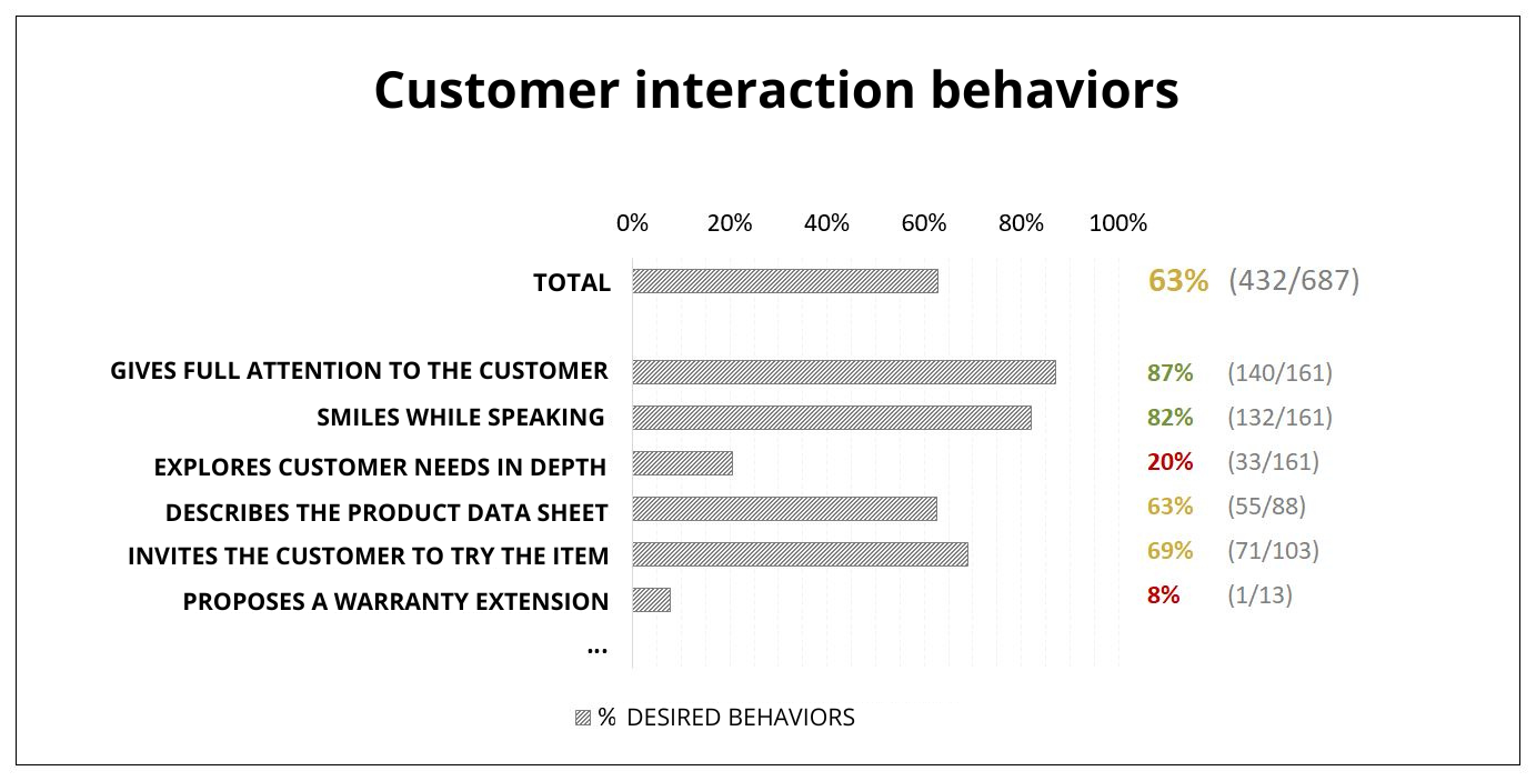 What emerges is a clear snapshot of the behaviors engaged in, with clear priorities for intervention: I hypothesized a problem related to the attitude of the staff (a particularly rude clerk and a few smiling faces), but looking at the overall picture, I notice much more widespread and crucial behaviors for the business, even if less striking.